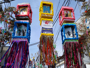 - お祭りをイメージした和柄と、お祭りを元気に楽しんでいる、可愛い女の子と猫を飾りました。